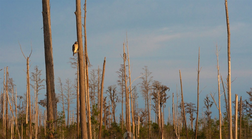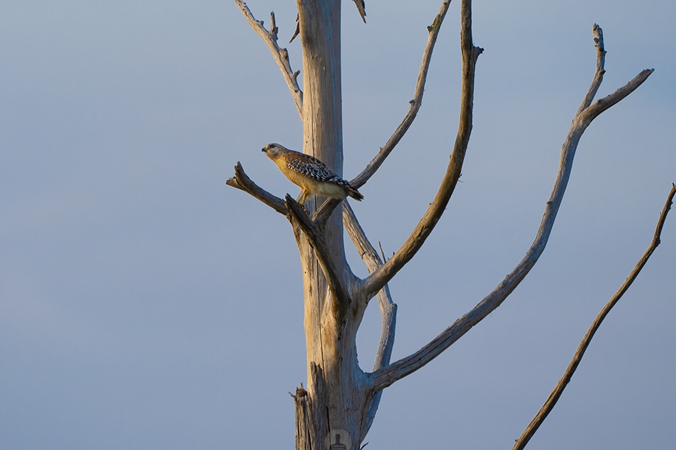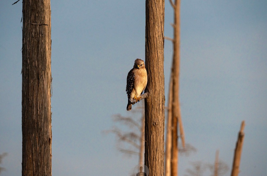 A lone red shoulder hawk sits perched and looking for its next meal in the early morning light. Hawks are a common bird of prey in the Okeefanokee area their diet consisting of small rodents and reptiles. If you like my photos and want to hang a print on your wall please visit my website by clicking here.